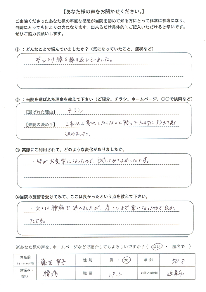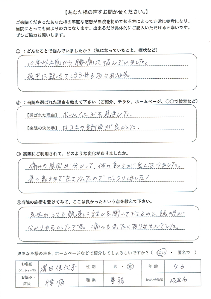 腰痛でお悩みの方で、岐阜市「岐山整体院」のお近くにいらっしゃる方はとても幸せだと思います。私は、林先生や笑顔で明るいスタッフさんのいる「岐山整体院」を強くオススメさせていただきます。