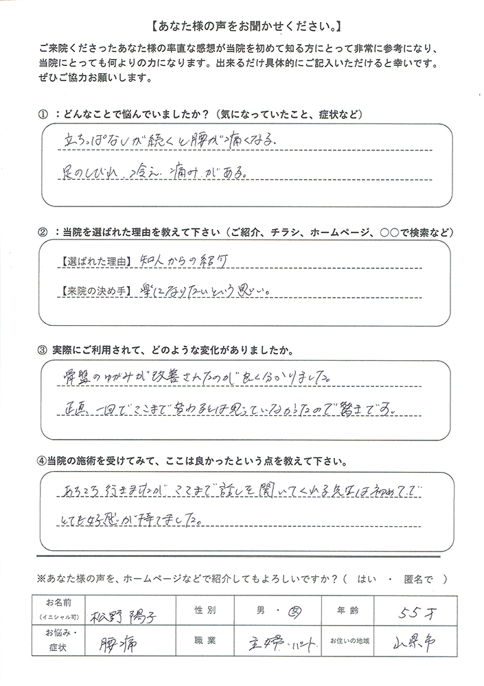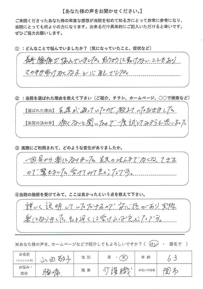 その事実を知ってから、現場での腰痛緩和率が大幅に向上し、多くの患者様からの喜びの声をいただきました。