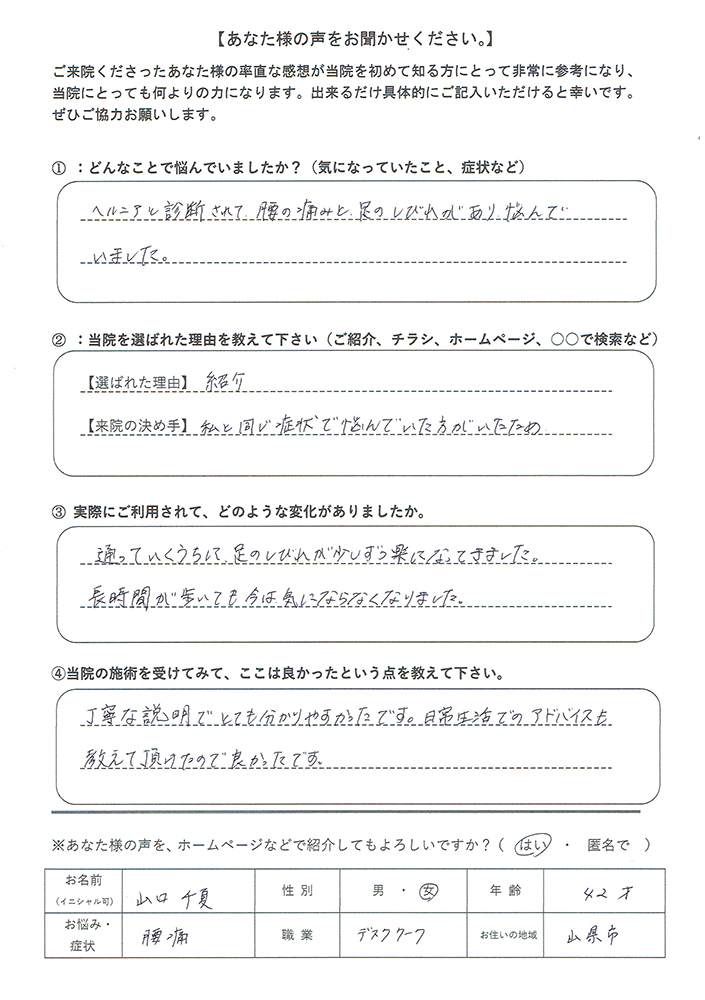 ヘルニアと診断されて、腰の痛みと足のしびれがあり悩んでいました。